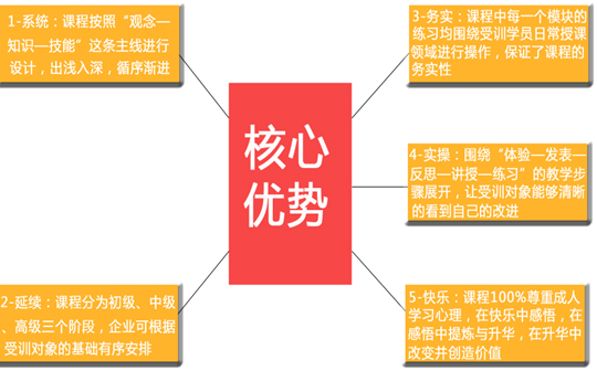 第五部分:课程时长 完整版课程标准时间为6天,在6天的课程中,企业可根据情况选择2天,4天或6天,其中: 2天版的内容包括:内容一、内容二、内容三、内容六四个模块; 4天版的内容包括:内容一、内容二、内容三、内容四、内容六五个模块; 6天版的内容包括上述6大模块中的所有模块内容。