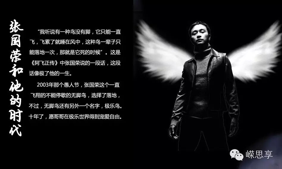 王家卫导演的香港经典文艺片《阿飞正传》里,张国荣饰演的阿飞说:“我听说有一种鸟没有脚,它只能一直飞,飞累了就睡在风中,这种鸟一辈子只能落地一次,那就是它死的时候”。无脚鸟一生都在不停地飞啊飞,都在苦苦追寻中度过,也许在寻找它的同伴、也许在寻找可以让它栖息的地方、也许在寻找它的双脚……
