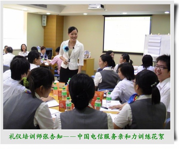 9月12号礼仪培训师张杏知受邀来到中国电信中山分公司的电信大楼为中山电信的近80位优秀而富有激情的营业员们做了两期的服务亲和力训练,在每个环节、细节的训练过程中,这些年轻热情的伙伴们都非常积极的参与,认真的演练,从有趣的训练中快乐的学习掌握着礼仪知识……