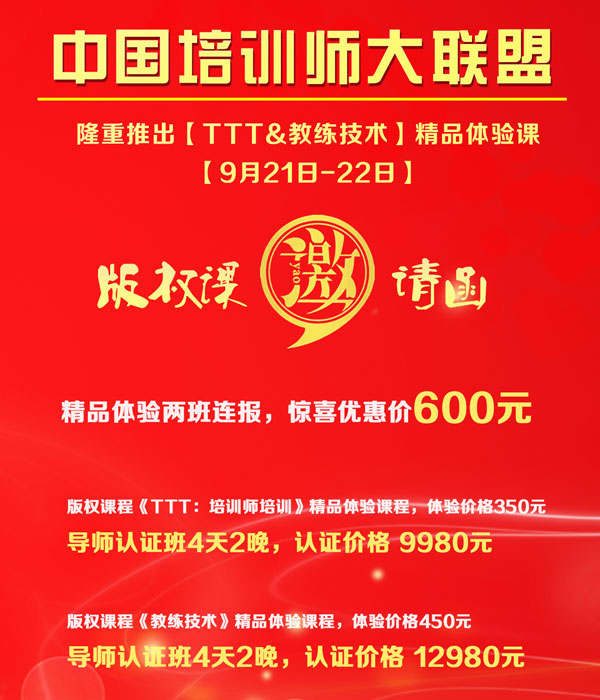 开课时间:《TTT:培训师培训》精品体验课--09月21日(星期三),350元/人